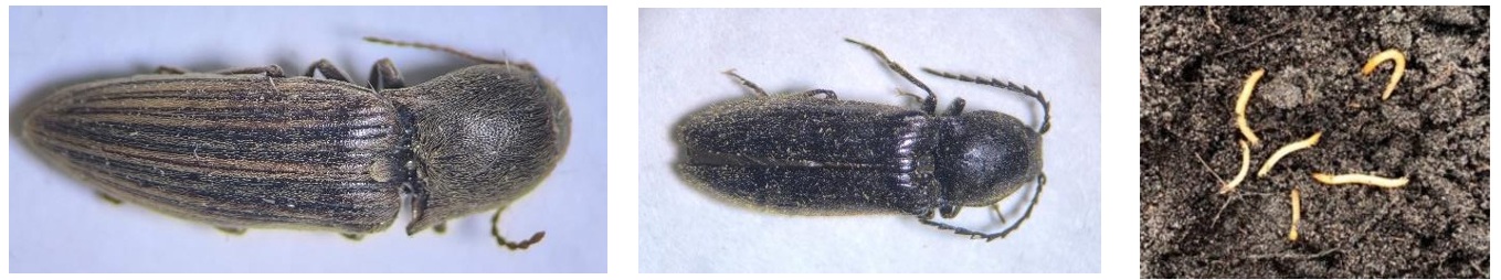 Имаго жуков-щелкунов рода Agriotes и Athous, личинки