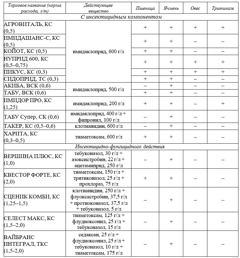 Регулирование численности личинок жуков-щелкунов в посевах яровых зерновых культур должно основываться на данных предварительного фитосанитарного мониторинга почвы с определением фактической плотности популяции вредителя. При превышении экономического порога вредоносности (16–20 ос./м²) целесообразно проведение предпосевной обработки семян инсектицидными либо инсектицидно-фунгицидными препаратами (таблица). Данный прием является стратегически важным элементом формирования благоприятного фитосанитарного состояния посевов, обеспечивая защиту растений в период от прорастания до 35–45 суток вегетации.